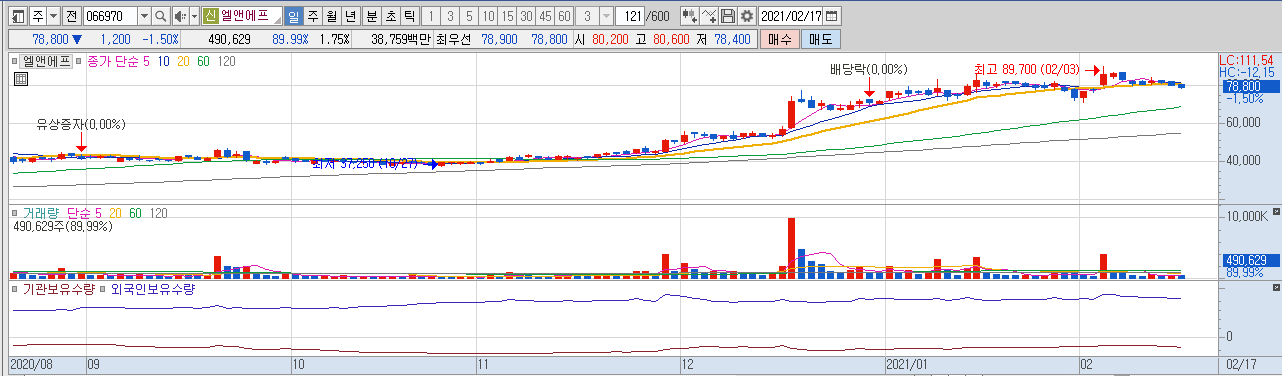 엘앤에프는2000년도에 설립되어 2003년에 코스닥에 상장한 회사이다. 시가총액 22000억원, per이 -601 로 약간은 생각하면서 매수해야 할 종목이다. 리튬이온 2차전지 양극재 소재인 하이니켈계 제품을 생산하고 있다. 최근 실적을 보면 영업이익이 좋지는 않으나 전기차 시장이 각광을 받게 되면서 차세대 배터리인 NCMA의 수혜를 받는 기업으로 생각한다. 엘앤에프는 최초로 NCMA 개발을 성공하였고 현재 니켈 함량 90퍼센트 제품인 개발도 진행중이다.